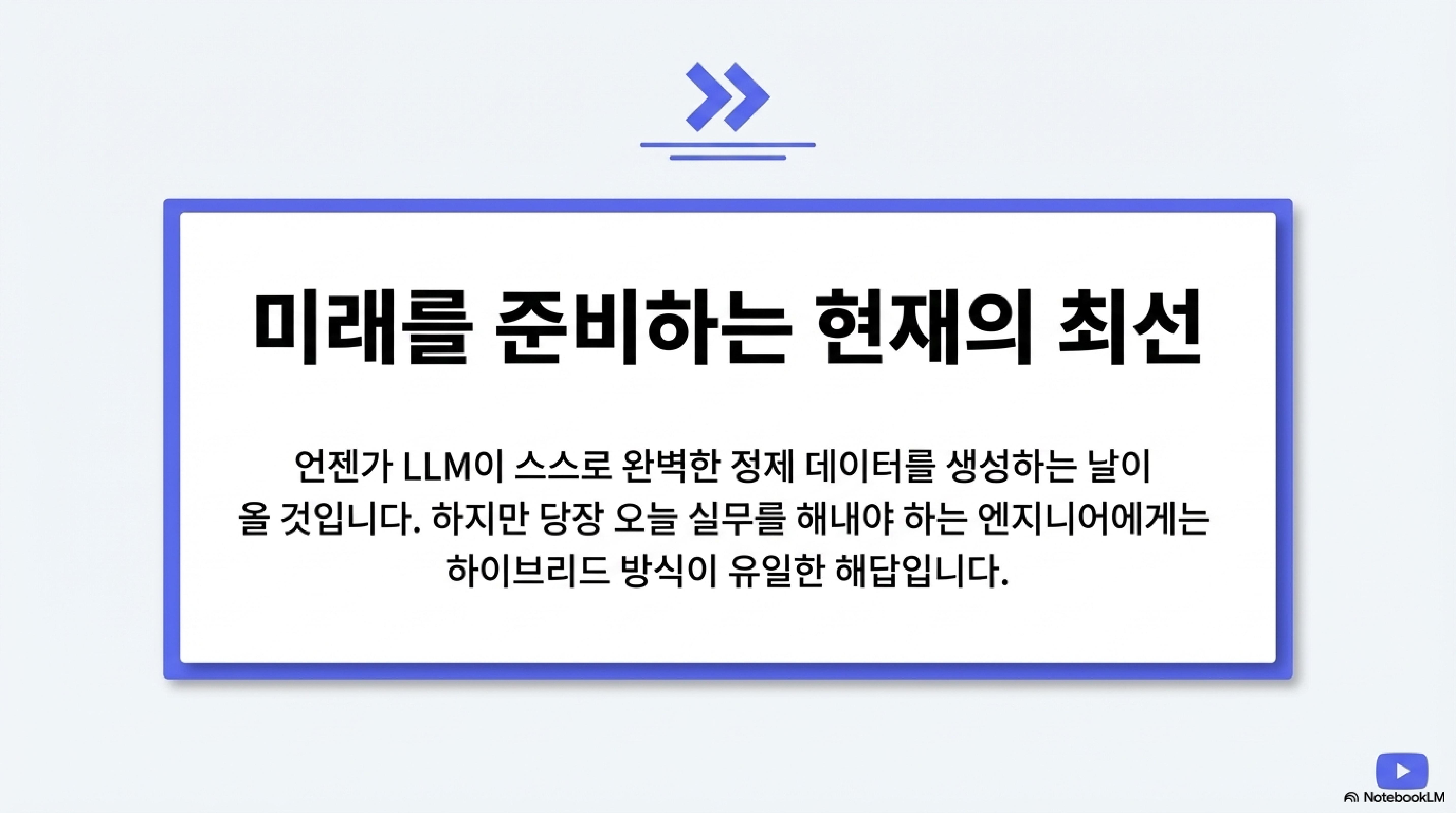 현재 기술 수준에서 LLM에만 의존하는 방식은 실무 적용에 한계가 명확하므로, 하이브리드 워크플로우를 구축하는 것이 필수적이다.