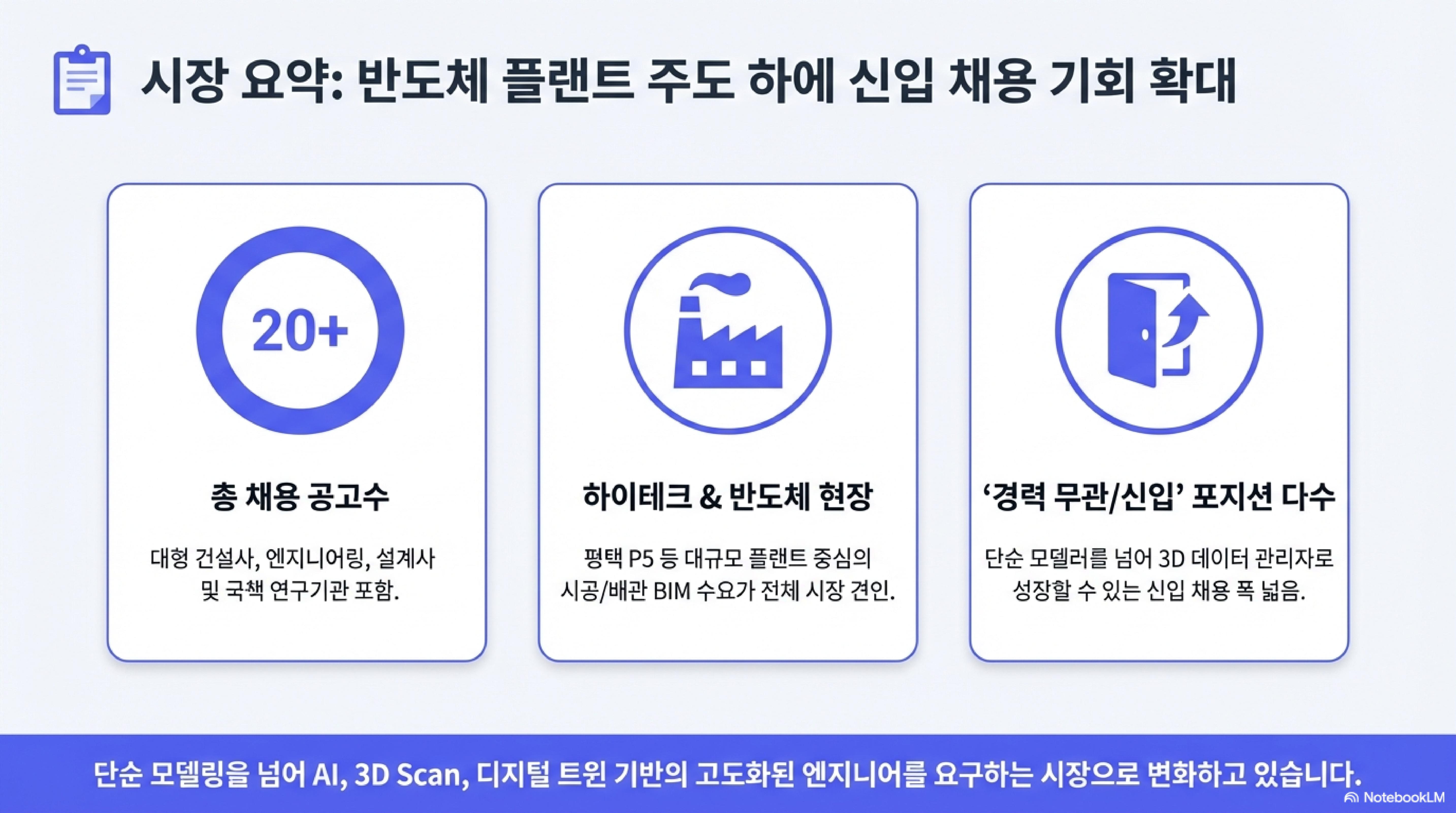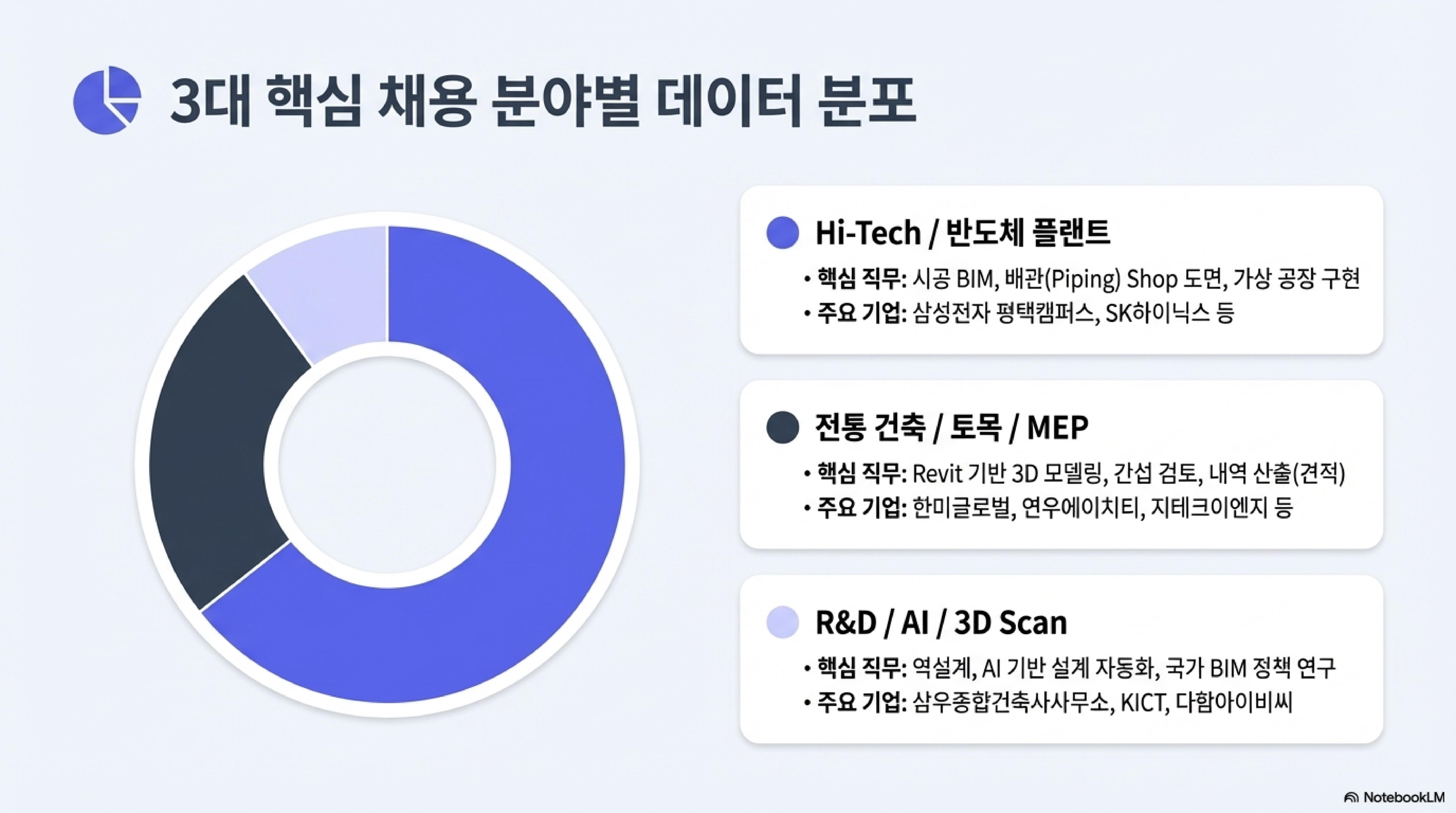 현재 BIM 채용의 중심은 단연 '하이테크 플랜트'입니다. 삼성전자와 SK하이닉스 등 글로벌 반도체 생산 시설 구축이 활발해지면서, 복잡한 배관(MEP)과 골조 공사를 정밀하게 관리할 수 있는 BIM 전문가를 찾는 기업이 줄을 잇고 있습니다.