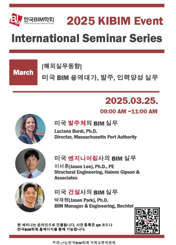 지난 20년 이상 동안, 우리나라의 BIM 실무는 “용역대가, 발주방식, 인력양성”라는 세 가지 만성적이고 반복적인 문제에 직면해 왔습니다. 미국 BIM 실무에서는 이러한 문제들을 어떻게 해결하고 있는지에 대해 배우는 기회를 갖고자 합니다.